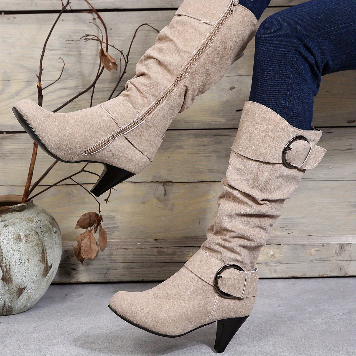 Fashionable Women's Slouchy Boots with Chunky Heels, Buckle Strap, and Pointed Toe - Easy to Pull On and Perfect for Any Occasion